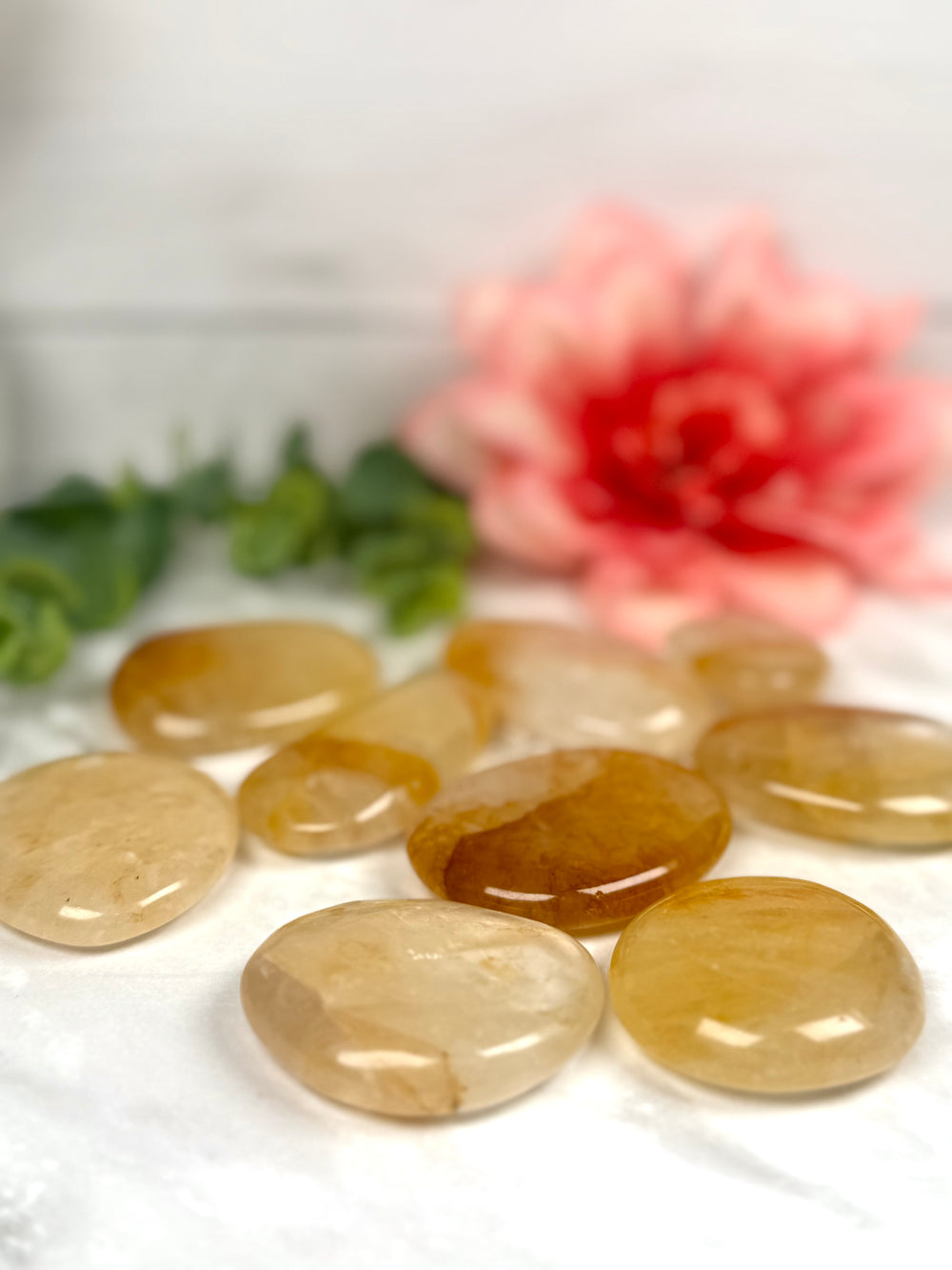 Every flat stone is completely unique, showcasing natural variations in color saturation, internal patterning, and clarity formed by hematite inclusions. Their smooth, palm-friendly shape makes them ideal for display trays, desks, bowls, or personal use, adding warmth, organic texture, and refined visual interest to any space.