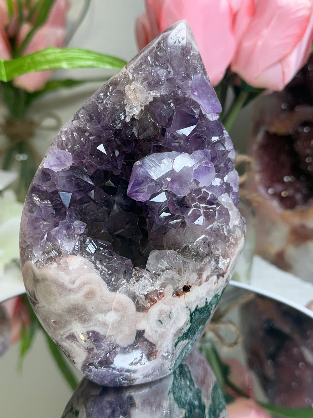 Elevate your space with our 6” Pink Amethyst Flame. This unique piece combines a stunning pink amethyst flame with a vibrant purple amethyst cluster and grounding green jasper. Transform any room with the calming and healing energy of these natural gemstones.