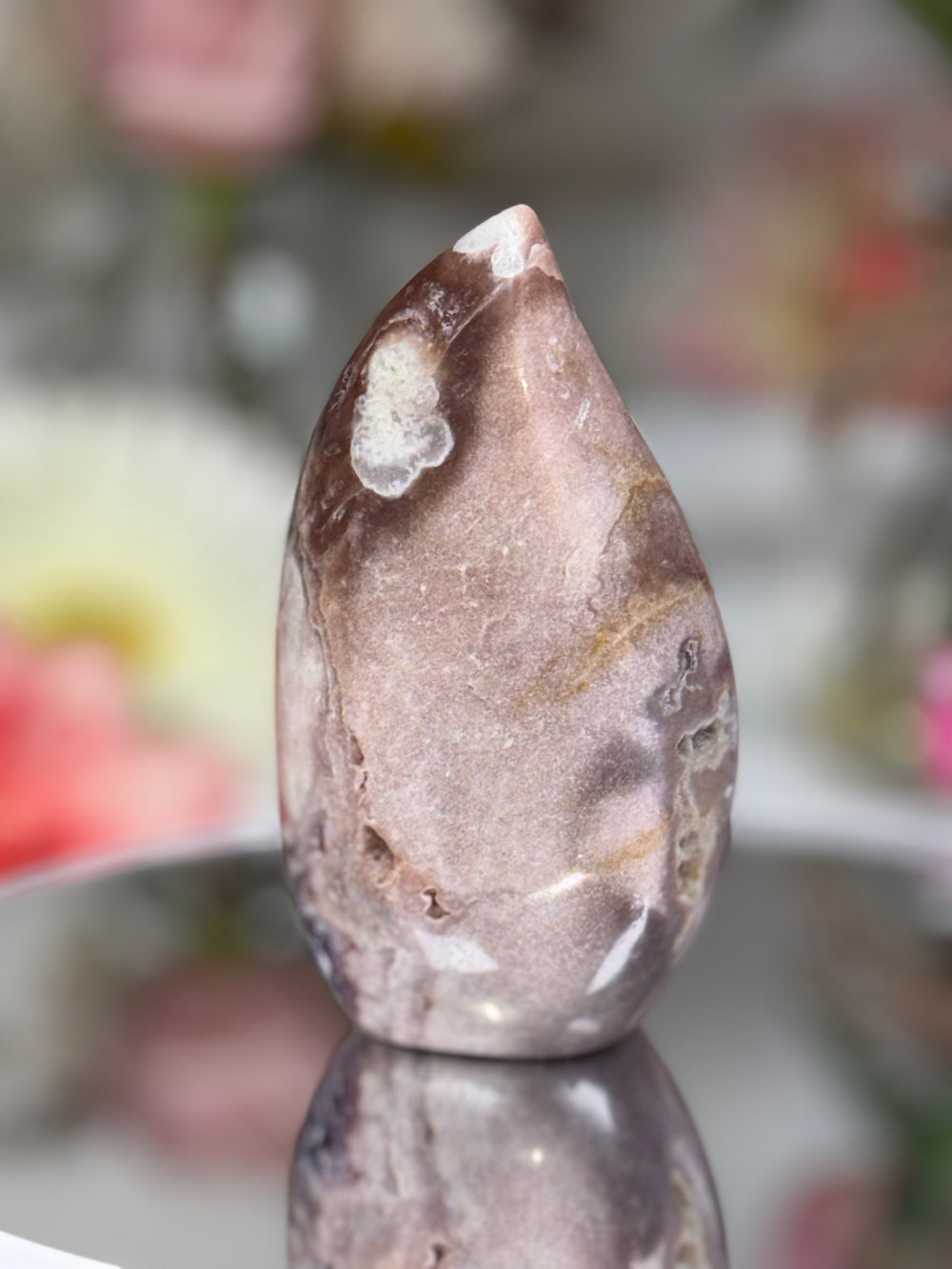 Every flame is completely unique, featuring natural variations in color, banding, and crystal formation. Its flowing contours and radiant interior catch the light beautifully, adding depth, warmth, and an elevated sense of artistry to any space. Ideal for styling on a bookshelf, vanity, altar, or curated display shelf where it can truly be admired.