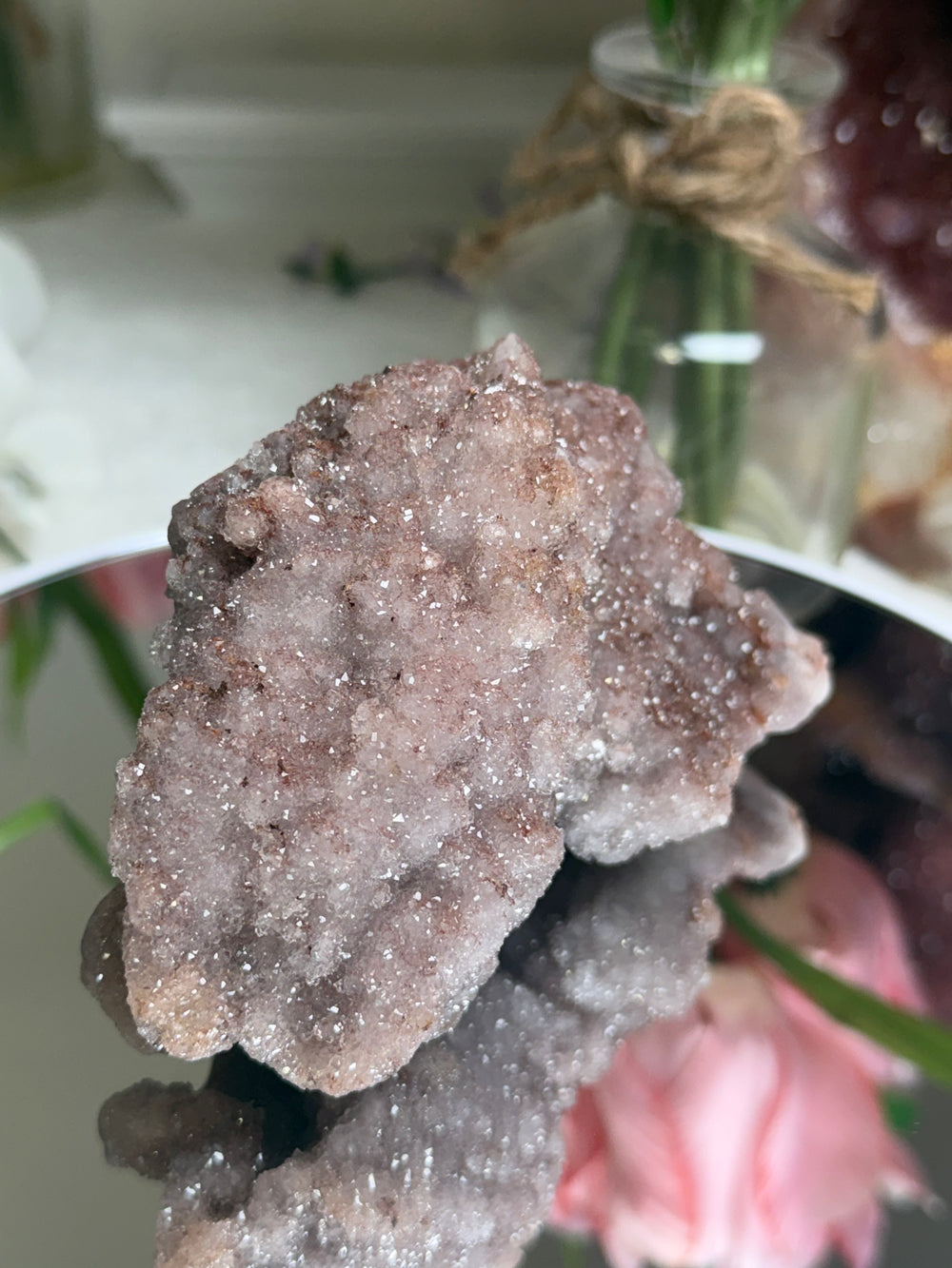 Expertly crafted and uniquely beautiful, our Pink Amethyst Freeform showcases a stunning druzy along its entire 2.5" x 4.5" frame. Experience the calming energy of pink amethyst while adding a touch of elegance to your space. Transform your home or office with this one-of-a-kind piece.