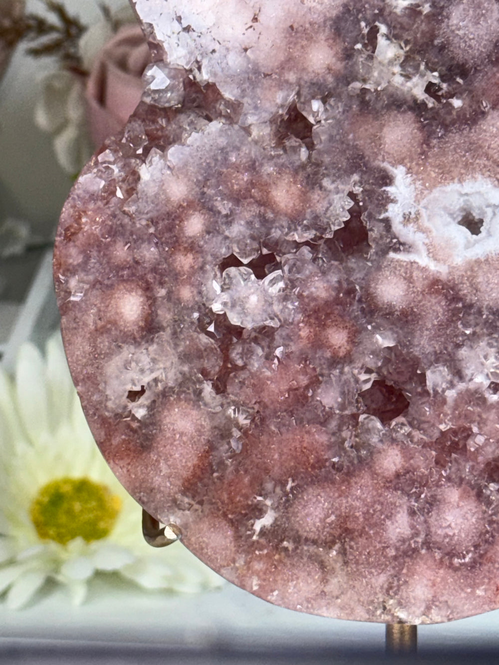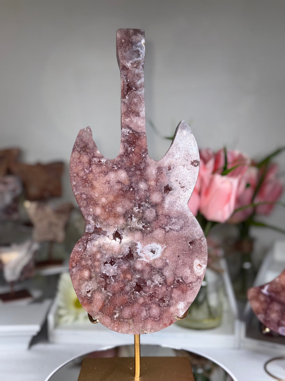 Elevate your collection with a show-stopping Pink Amethyst guitar displayed on a gold stand. Each piece is hand selected for its rich pink tones, dazzling crystal formations, and expressive, statement-making silhouette. This rare carving blends artistic flair with refined elegance, making it a truly distinctive centerpiece for collectors who appreciate both beauty and individuality.