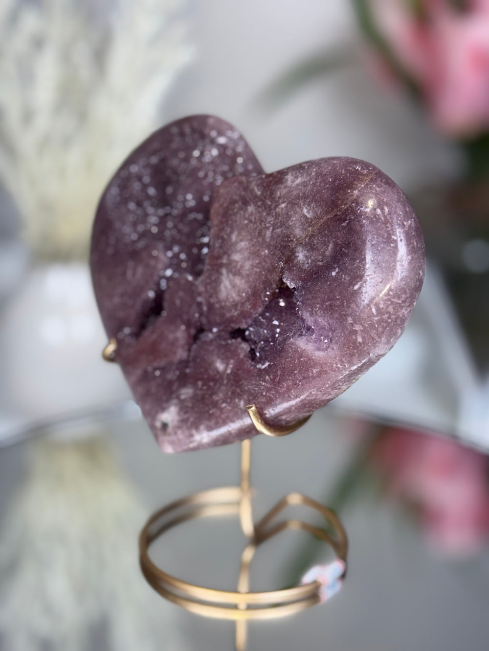 Every heart is completely unique, with natural variations in color, pattern, and crystal formation. This piece adds a gentle feminine glow and sophisticated charm to any space, especially when styled on a vanity, bookshelf, altar, or display shelf.