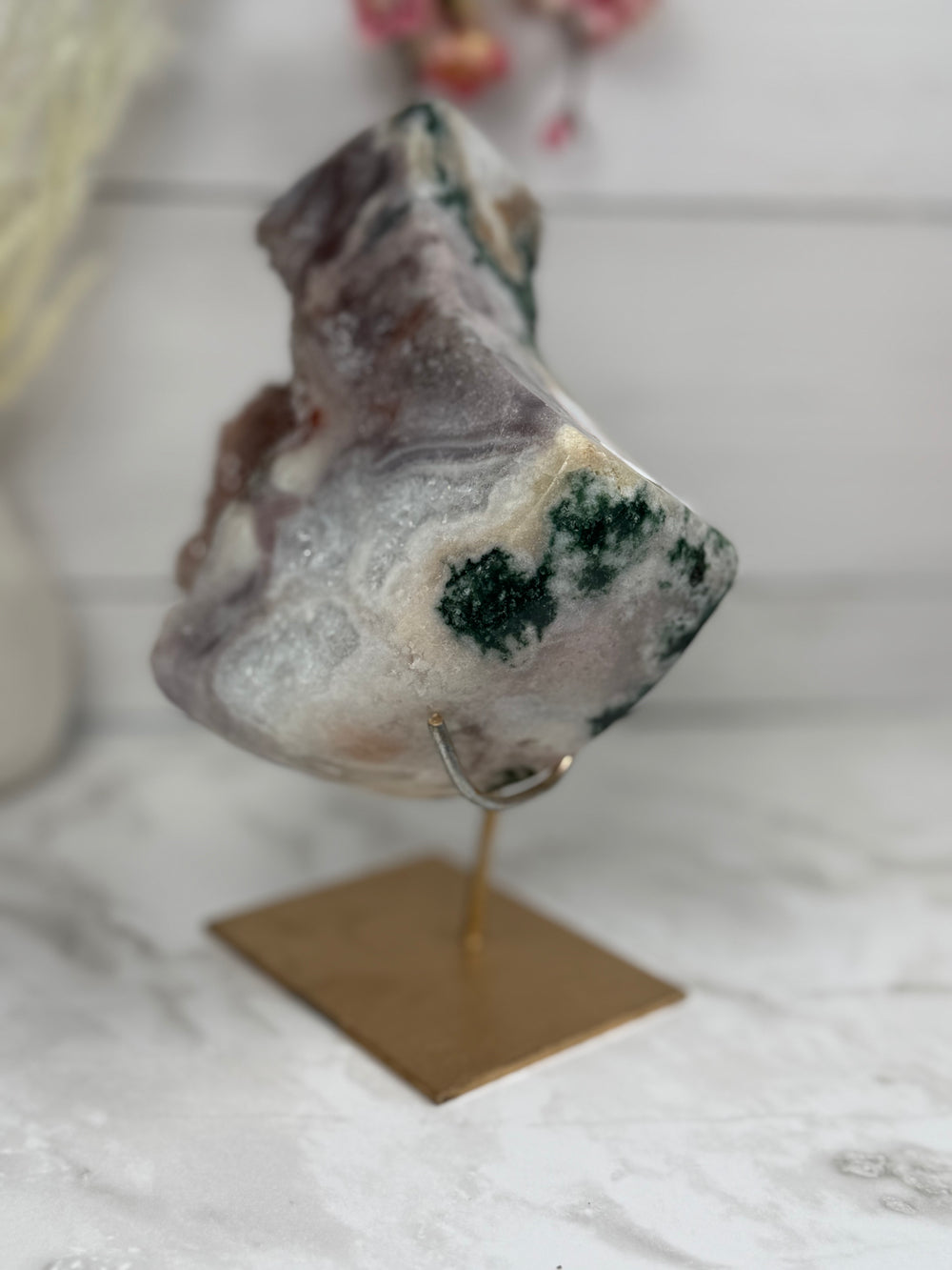 Elevate your collection with a captivating Pink Amethyst moon displayed on a gold stand. Each piece is hand selected for its soft rosy hues, radiant crystal formations, and enchanting celestial silhouette. Pink Amethyst is cherished for its calming, nurturing presence and refined aesthetic, making it a beloved choice for collectors and sophisticated home décor styling.