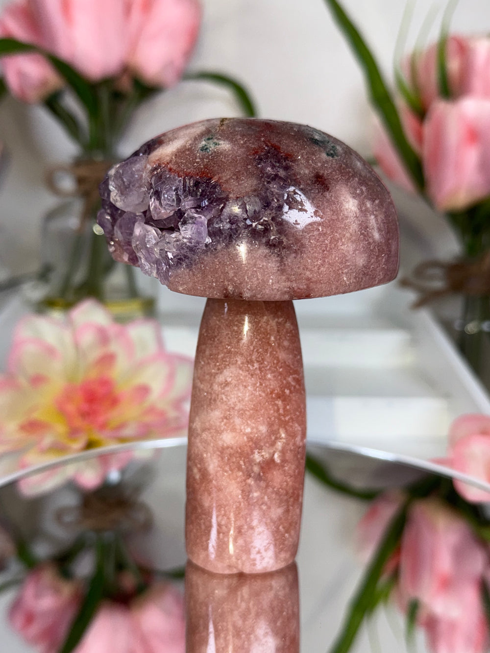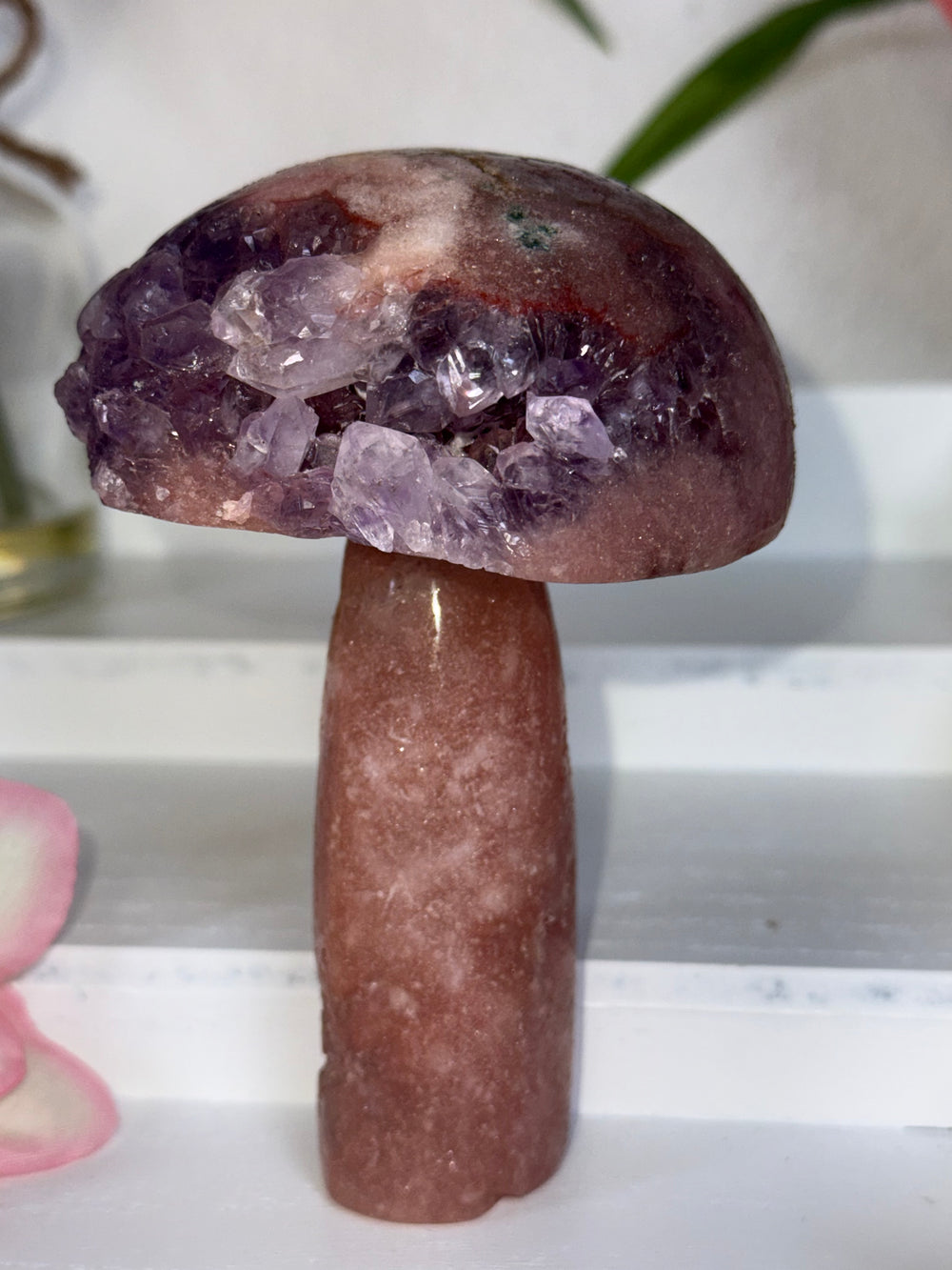 This Pink Amethyst mushroom is a true standout for any luxury crystal collection. The cap features a striking open crystal pocket with sparkling lavender amethyst points that catch the light beautifully. The stem has a velvety rose finish that feels soft and earthy, creating a grounding contrast to the glittering crown of crystals above.