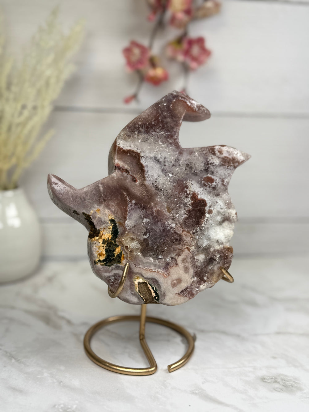 Each crystal is sourced from Brazil and chosen for its high quality and visual appeal. The golden stand provides a polished, elevated presentation, allowing the carving to be displayed as a refined statement piece with a hint of playful elegance.