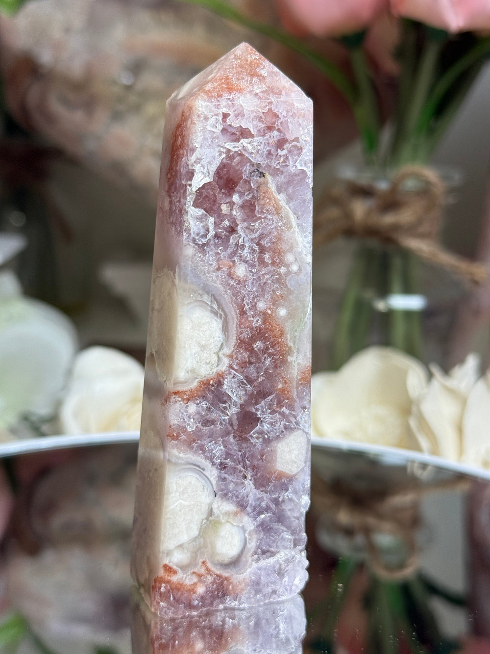 This Pink Flower Agate tower features rich, saturated blush-pink tones with subtle natural banding that make it truly stand out. At 4 inches tall, it’s polished to a smooth, glossy finish that enhances its depth of color and natural beauty.